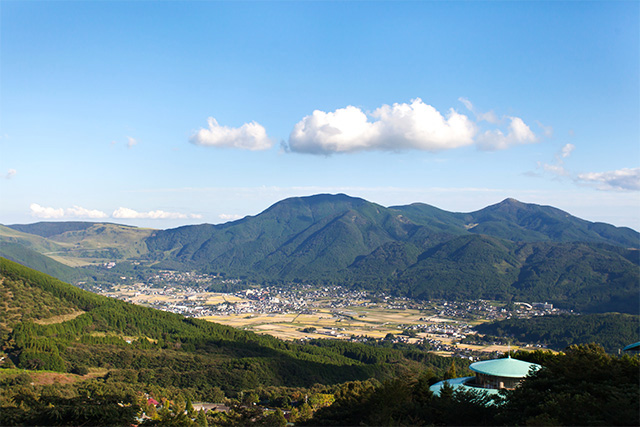 由布岳からくじゅう連山まで続く雄大な眺望、あの朝霧も眼下に広がる標高700mに